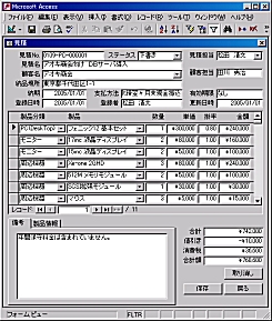 このように、Ninja-VAのコンポーネントは、Accessのオブジェクト構成に紐付けることができることが分かるだろう。Accessのオブジェクトとそのプロパティ情報を、Ninja-VAのコンポーネントとそのプロパティに移行できれば、画面とデータ構造に関してはほぼシームレスに移行できるはずだ。ここにヒントを得て開発したのが、Accessアプリケーションを実行しながら、フォームやコントロールオブジェクトを解析、その情報をNinja-VAのIDEであるNinja-VA Studioに取り込んで、Accessと同様にWYSIWYGでフォームやデータテーブルを設計できる一連のノウハウを盛り込んだツール「A2Jaws」だ。 では実際に、A2JawsがAccessアプリケーションをWebアプリケーションに移行する流れを見てみよう。 以下が、マイグレーション対象のAccessアプリケーション(見積もりシステム)である。