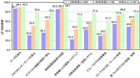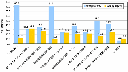 信頼性の高いITインフラを構築する。ITへの依存度が高まっている中、優先すべきは信頼性、システムの継続性であることに関して、異論を挟む余地はない。では、どのような手法で信頼性を確保しようとしているのか。 圧倒的に多いのはサーバ機器の冗長性強化、信頼性を優先したアプリケーション構築、柔軟かつ安全性の高いデータ管理など、情報技術による解決策を最も重視するというユーザーである。ついで標準化やシステム構築の文書化など方法論や手順による対策、人員配置やトレーニングなどの人的資源対策と続く。しかし、物理インフラの改善に積極的に取り組もうというユーザーは、大規模システムを持つユーザーでも13%を切り、小規模ユーザーでは10%以下となる。