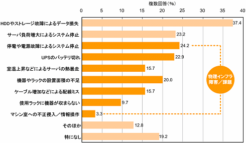 このアンケートは@ITに登録している、いわばITに対して高い意識を持った読者に対して行ったものであり、一般的な利用者の間では物理インフラに対する意識はさらに低いと考えるのが妥当だろう。では物理インフラは軽視しても良いのだろうか? 実は別の設問では、まったく相反する結果が出ている。 過去1年にマシンルームで発生した障害もしくは課題を挙げてもらったところ、停電や電源故障によるシステム停止、UPSのバッテリ切れ、機器やラックの設置面積不足、室温上昇によるマシン暴走など、物理インフラに関する障害や課題を経験したユーザーは、実に全体の63%にも達している。