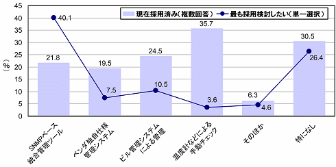 これは例えば、アンチウィルスとファイアウォールは導入しているが、その後にどのような対策を行うべきか分からない、という状態に似ている。定番の対応策はすでに導入した。しかしその後、具体的にどのようにすれば良いのか分からないわけだ。もちろん、障害を経験すれば、それに対する対応策も思い浮かぶだろう。しかし、それでは遅すぎる。 一方、大規模ユーザーはアンケートで選択肢として挙げた対策の多くに着手済みだ。システム停止による影響が大きい分だけ、マシンルームの脆弱性に対する意識がより高いためであろう。 ところが物理インフラの検査・点検をどのように行っているかといえば、ほとんどは手動による検査である。これでは障害発生時の対応が遅れるだけでなく、検査・点検にかかる運用コストも馬鹿にできない。大規模ユーザーであれば、検査・点検を行うべき対象は膨大な数になる。一方、小規模ユーザーは専任のシステム管理者を置くことが難しく、同様に物理インフラの管理が大きな負担になっているケースが多い。