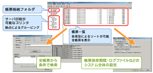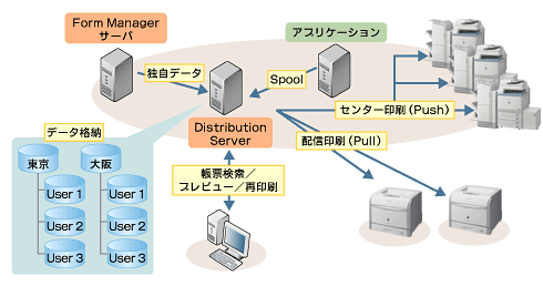 Distribution Serverに保存されている帳票は、Form Managerサーバで再度オーバレイを実行することなく、直接再印刷することができるので、トランザクションを軽減することもできる。 Distribution Serverには、管理者用の「配信管理クライアント」が提供されている。直感的で分かりやすい管理画面から、印刷可能なプリンタの登録や設定変更、帳票ごとの保存期間などDistribution Serverが管理している情報をコントロールできるようになっている。
