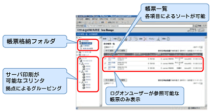 帳票で扱われる情報には、顧客情報や財務情報など企業にとって非常にクリティカルなものが含まれていることも多い。そのため、配信される帳票の管理は、極めて重要な問題といえる。Distribution Serverでは、ユーザーの権限を管理し、ユーザーが保存した帳票、印刷ジョブ、出力する権限のあるプリンタをWebMonitorから確認することができるようになっている。