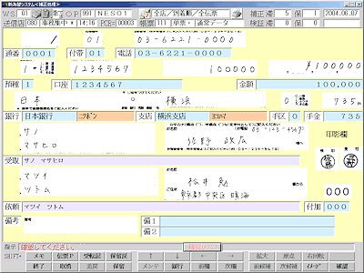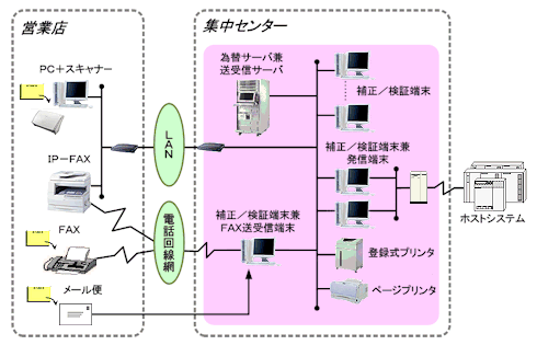 営業店側は、顧客の記入した各種原本をスキャナーでイメージデータ化し、それに対して、金額や振込先などの書き漏れがないか、簡単なデータチェックを行う。そのイメージデータは事務センターに送信され、そこでOCRにかけられて文字認識される。文字データは誤読や不読をオペレーターによって補正され、役席者によって検証された後、ホストに送信されるのだ。