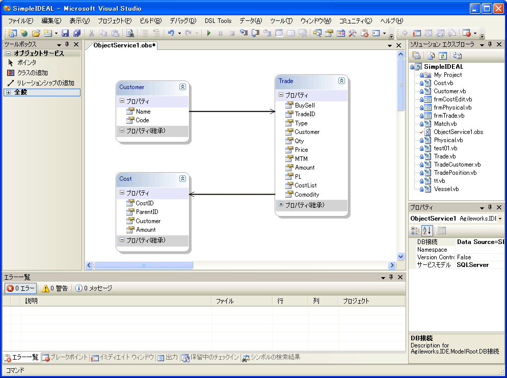 O/Rマッパー製品は多数あるが、通常、複数の設定ファイルが必要で記述や保守が煩雑な場合が多い。こうした問題を避けるため、ObjectServiceでは、モデル定義、クラス設計、テーブル作成などの記述を1つのファイルに集約し、そのファイルをVisual Basicの開発環境であるVisual Studioのデザイナ画面を使って編集できるようにしている。Visual Basicの開発環境の中で、シームレスにO/Rマッピングを設定できるため、開発環境に自然な形で導入できるというメリットがある。