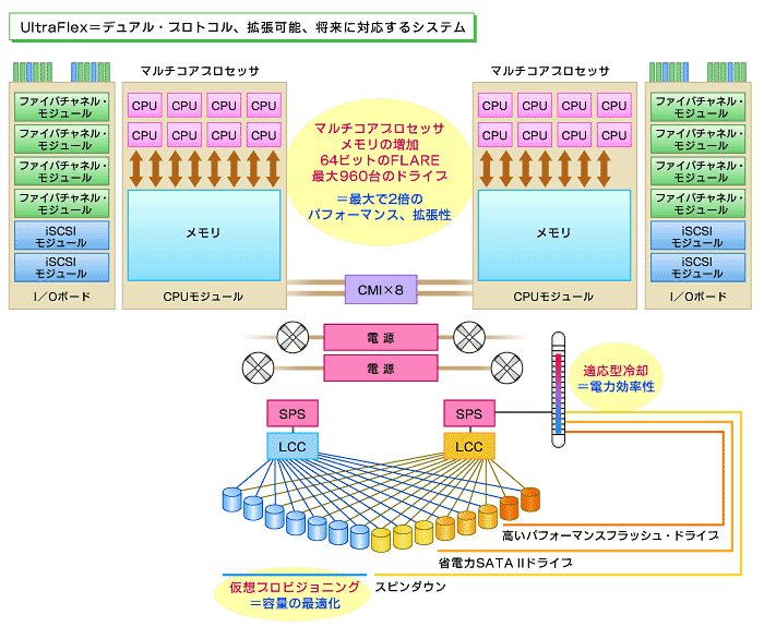 ストレージプロセッサは2重化されており、さらに内部に複数のマルチコアプロセッサ(IAベース)を搭載することで、処理性能と実装メモリ量を2倍に拡大している。I/OボードはストレージプロセッサのCPUモジュールから分離され、独立したモジュールとなった。このため、システムを停止させることなくI/Oポートを増減できる「ホットプラグ」が実現したほか、複数のプロトコルの混在や、将来登場するより高速なI/Oポートの実装などにも対応し、信頼性と柔軟性を大幅に高めることができた。