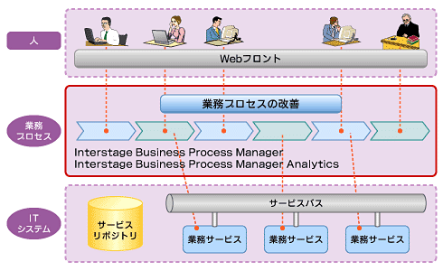 Interstage Business Process Managerは、人手による業務とITシステムを統合することにより業務プロセス全体を自動化し、管理するBPMソリューションである。SOAを支える同社のミドルウェア製品群の中核に位置付けられる製品であり、BPM分野における国際標準技術であるBPMN(*1)やXPDL(*2)、BPEL(*3)にもいち早く対応している。