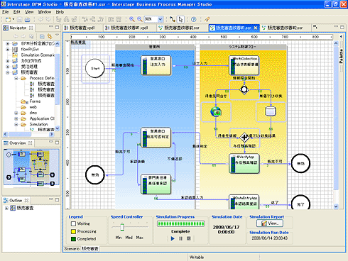 また、業務プロセスの実行状況や作業状況の履歴を集計・分析することで、業務改善のための具体的な問題点を明確にし、業務プロセスの最適化、および継続的な業務改革につなげることができる。この履歴情報は、さらにInterstage Business Process Managerのシミュレーション機能でも活用できる。実際に業務プロセスを実行した際の履歴データを基にシミュレーションを行うことにより、より精度の高いシミュレーション結果を得ることができるのだ。