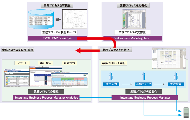 具体的には、業務プロセス可視化サービス「EVOLUO-ProcessEye」、業務プロセスの文書化では「Valuevision Modeling Tool」、業務プロセスの自動化(システム化)では「Interstage Business Process Manager」、業務プロセスの監視(モニタリング)では「Interstage Business Process Manager Analytics」を改善フェーズごとにラインアップ。