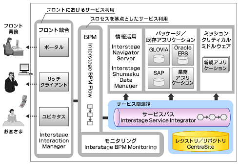 1つは、標準プロトコルでサービス化されたシステム同士を連携させること。一般的には「サービス間連携」と呼ばれる。そしてもう1つは、新規サービスだけではなく、既存システムをもサービス化し、一元的に管理すること(SOAガバナンス)だ。企業内に多数存在するCOBOLで作成されたアプリケーションをサービス化し、JavaやC++などで作成されたアプリケーション資産と連携し、活用できるのだ。 それでは以下、サービス間連携を支援する富士通のサービスバス製品「Interstage Service Integrator」とSOAガバナンスを支援するサービスリポジトリ「CentraSite」の機能的な特長を解説しよう。