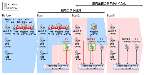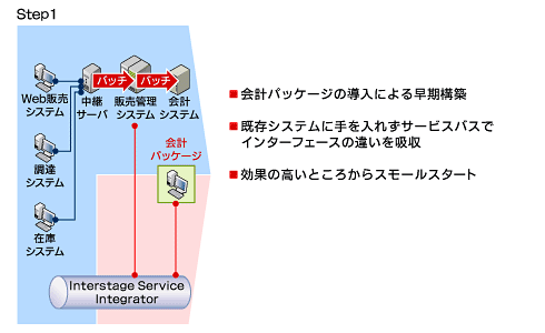 「段階的」と単純にいっても、どの部分のどんな業務からスタートし、どういうステップで移行を進めていくのかというプランニングも、システム再構築を成功させるための重要なポイントとなる。今回の事例では、まず、ステップ1でメインフレームで行っていた会計業務をオープンシステム上のパッケージに移行し、ステップ2で販売管理業務をパッケージに移行するとともに各周辺システムとのリアルタイム連携を実施。そして、ステップ3で既存システムから完全に切り離し、新システムの本運用を開始する、という3つのステップで、約14カ月をかけて段階的な再構築を実現した。 ここからは、各ステップでどんな作業が行われたのか、そのポイントを具体的にみていこう。 ステップ1の会計システムの刷新では、オープンシステムで稼働する会計パッケージを導入し、既存システムには手を加えずに「Interstage Service Integrator」でインターフェースの違いを吸収することで、販売管理システムとのデータ連携を実現した。会計パッケージとしては、「GLOVIA smart」を使用し、短期・低コストで新会計システムを構築。この際、旧会計システムのバッチ処理によるデータ連携も継続して行っており、会計パッケージと並行稼働しながら業務検証を行うことにより、確実なシステム移行を目指した。