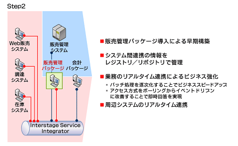 ステップ2では販売管理システムの刷新に着手。会計システムと同様、オープンシステム上に販売管理パッケージを導入し、旧システムと並行稼働しながら業務検証を行った。 このステップでは販売管理システムの刷新と併せて、中継サーバの撤廃と、各種周辺システムのリアルタイム連携も行われた。Web販売システム、調達システム、在庫システムなどの周辺システムは、それぞれ個別で開発されたオープンシステムで、従来までは、それぞれのデータを中継サーバに集約し、バッチ処理で販売管理システムと連携していたが、「Interstage Service Integrator」を介し、すべてのシステムのデータ連携が可能になった。 ここで重要となってくるのが、周辺システムのハードウェア情報やシステム構成、インターフェース、バッチ処理、データフォーマットなどの資産情報だ。開発されたシステムはどのようなもので、どんなデータをもち、どんなビジネスプロセスを担っているかなど、周辺システムに関する各種情報が把握できなければ、SOA導入によるリアルタイム連携は不可能。しかし、各周辺システムは、開発されてから長年の保守対応で、システムが肥大・複雑になっていたり、設計書が更新されていなかったり、開発当時の担当者がすでに社内にいないなど、詳細な資産情報を収集するのは容易ではないのが実情。 そうした状況のなか、今回の事例では、すべての周辺システムに対して、資産情報の現状調査を徹底して行い、サービスリポジトリ「CentraSite」にその情報を集約することで、SOA適用に向けた既存システムの見える化を実現している。「CentraSite」で一元管理した項目は、バッチ処理におけるプロトコル、データフォーマット、呼び出し方向を始め、バッチ処理連携パターン名、バッチ処理実行順序、稼働マシンのホスト名、IPアドレス、設置場所、さらにはサポートの担当者や連絡先など。そして、集約された資産情報をマスターとして活用することで、今後、システム更新が行われた際には、容易に更新管理を行うことが可能となり、メンテナンス性も向上する。