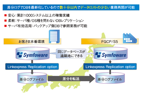 具体的には、本ソリューションに掛かるコストは数百万円と、かなり安価に抑えられている。その理由は、ストレージシステムのリモートコピー機能に依存せず、ソフトウェアの機能だけで全てをまかなう形としているためだ。Symfoware Serverの上位エディションに標準搭載されている「Linkexpress Replication option(下位エディションはオプション追加で利用可能)」を使い、ソフトウェアの機能だけでログの差分データをバックアップサイト側に転送する仕組みとしているのである。