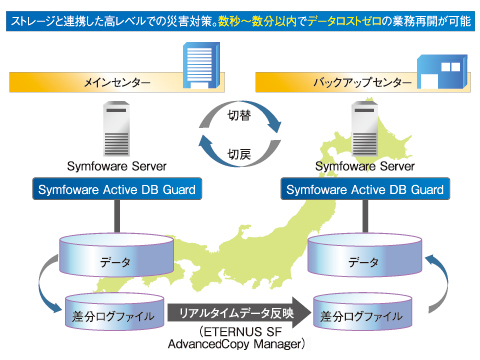 この仕組み全体を構成するのは、データベースソフトウェア「Symfoware Server」と、そのオプション製品「Symfoware Active DB Guard」、そしてストレージシステム「ETERNUS(エターナス)」だ。この3つを組み合わせたデータベース環境を、本番サイト側とバックアップサイト側、それぞれで構築する。
