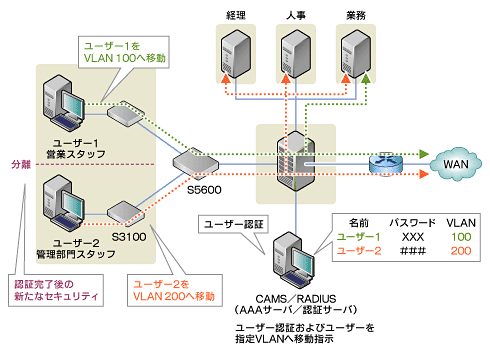 Quidway S3100のもう1つの特徴はセキュリティ機能である。低価格のデスクトップスイッチであるにもかかわらず、IEEE標準規格の802.1X認証とMACアドレス認証の2つの認証方式をサポートしている。 昨今のネットワークセキュリティは、ゲートウェイにファイアウォールを設置したりVPNを導入したりするだけでは十分でないということが周知されてきた。なぜならば、外部からの攻撃よりも社員のうっかりミスあるいは明確な悪意を持った内部犯による情報漏えい、持ち込みPCによるネットワーク内部から不正アクセスの方が危険性が高いということが分かってきたからだ。それを防ぐための基礎となるのが、アクセスする権利を管理する認証の仕組みである。 無線LANでのユーザー認証に使われることが多い802.1X認証だが、有線LANでも利用できる仕様になっている。その仕組みは、RADIUSサーバなどの認証サーバと連携して、ユーザーIDとパスワードによってクライアントを認証し、認証に失敗したクライアントからの通信を遮断する。 ポートを利用するユーザーを限定する「1ポート:1ユーザー」という仕様であるため、もっともクライアント側に配するスイッチ(無線LANの場合はアクセスポイント)が802.1Xに対応している必要がある。有線LANよりも無線LANでの導入例が多いのは、それが理由だ。 Quidway S3100をデスクトップスイッチとして導入すれば、この802.1X認証を利用した認証ネットワークを全社的に導入することが可能になる。さらに、認証VLAN(Dynamic VLAN)を組み合わせれば、ログイン時に社内ネットワークへの参加の認証とともに、自分の部署に関わるサーバにのみアクセス可能にすることができる(図1)。