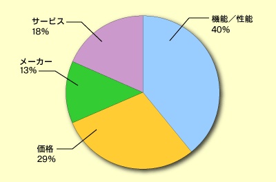 サーバ製品の選択肢として、「製品の機能/性能」「価格」「メーカー」「コンサルティング/サポートなどのサービス」の4点各項目の重視度の比率は、「機能/性能:価格:サービス:メーカー」でおおよそ「4:3:2:1」の順となった。