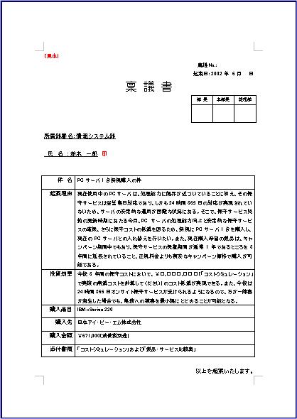 重要なことは、起票者が「良い」と思ったことを、ほかの意思決定者にも「良い」と納得させることである。そのためには、読ませることを意識しながら、伝えたいことを後押しするような資料とともに「稟議書」として提出することだろう。 以下に稟議書とそれに添付する資料のサンプルをご用意したので、参考にしてほしい。なお、それぞれダウンロード、プリントアウトできるので、ぜひともご活用いただきたい。