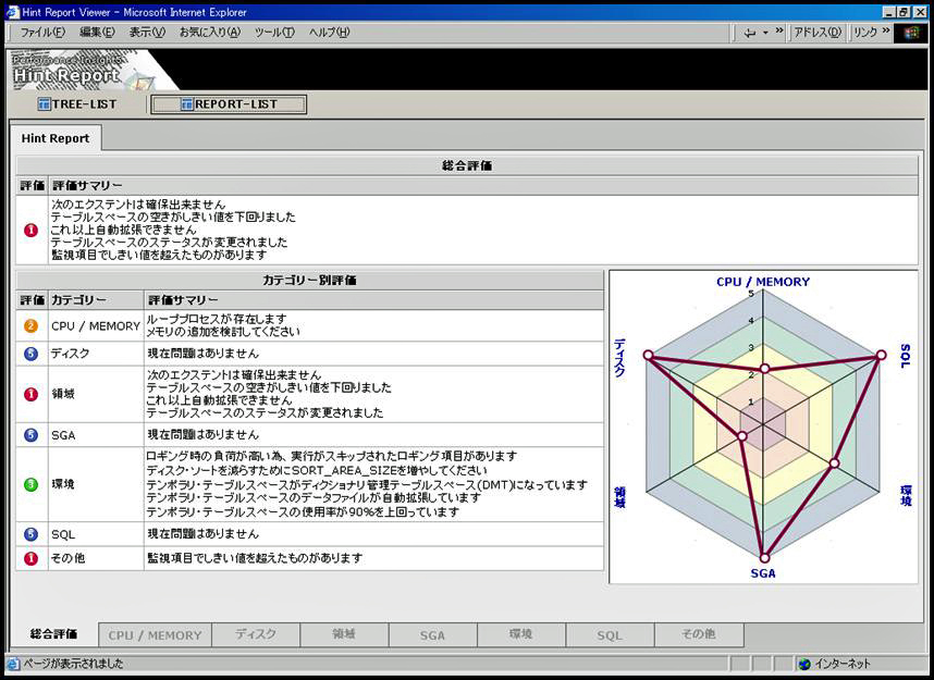 それぞれの機能の詳細を見てみよう。 ■診断レポート――問題解決のためのレポートとアドバイス 問題解決には、データベース、OS、ストレージ、アプリケーションなどそれぞれに対して、深い知識を持つ「職人」的な熟練エンジニアのノウハウが必須となるケースが多い。クリティカルな場面で利用されるシステムなどでは、いかに迅速に問題を洗い出し、対策するかが重要だ。だが、実際には、コストや時間、さまざまな要因から、すべてのプロジェクトに熟練エンジニアを配置することは難しい。
