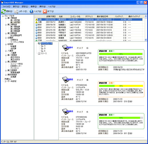 HDDの故障は大きな脅威である。一度HDDが故障してしまうとその交換作業、バックアップを戻す作業などをシステム管理者が行う必要がある。PCを大量導入した場合、使われているHDDもほぼ同じような推移で劣化していく可能性があり、1台故障すると同時に購入したHDDが次々と壊れていく可能性が高い。そうなったとき、システム管理者は本来行うべき作業が完全にストップし、HDD故障対応という突発的作業に追われることとなる。 中大規模ネットワーク向けの新製品である「SmartHDD Manager」は集中監視でその危機を乗り越える。各クライアントにエージェントをインストールすることで、部署内にあるHDDの統計情報をまとめて管理することができるのだ。 対象となるHDDはクライアントのPCに内蔵されたものだけではなく、USBで外付けされたHDD、そしてネットワークストレージ(NAS)を含む2000台の管理が可能だ。ここで危険と表示されたPCに対しては、算出された故障予測日を元に、HDD交換作業のスケジュールを立てられるのだ。