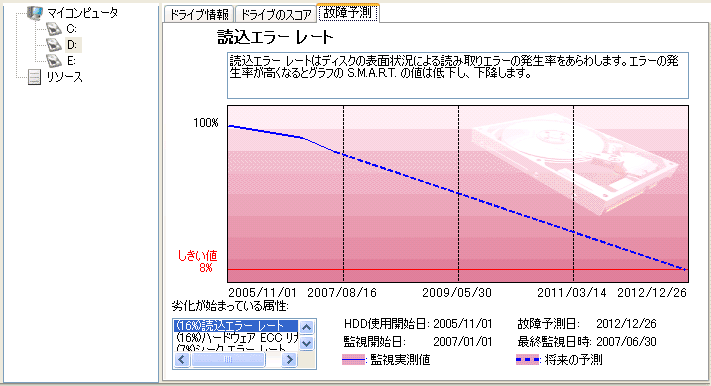 PCの構成要素として、HDDは欠かせないものである。HDDは精密機械であり、壊れるときは壊れてしまうという認識はあっても、自分のHDDだけは壊れないと思ってる人も多いだろう。しかし、HDDはいつか壊れるのである。故障により作業がストップしてしまうと、HDDのデータだけではなく、PCを操作する人の集中力も元に戻す必要がある。これは決して簡単な作業ではない。 HDDの故障は突然起きるものなので、事前の準備はできない……であれば、事前に予測さえできれば修理の準備も心の準備もできるのではないだろうか? そこでSmartHDDの「故障予測機能」に注目したい。 HDDには標準でS.M.A.R.T.と呼ばれる自己診断のための機能が備わっている。これはHDDの「読み込みエラーの発生率」や「温度」、「ディスクの回転の再試行回数」などの統計情報の取得が可能な仕組みで、故障が発生する直前ではこれらの数値に変化が現れることが多い。 SmartHDDはこの統計情報を常に監視し、独自の判断を行うことでリアルタイムにHDD健康状態を算出する。不調なHDDに対しては故障予測日と、その日までの劣化の推移をグラフ表示することも可能だ。これにより、まもなく問題が発生するかもしれないPCが判別でき、重要なデータの消失を未然に防ぐような運用ができるのである。