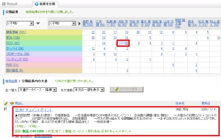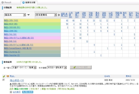 そこでB社では、ConceptBase Vを用い、営業報告書の各項目を属性として設定し、この属性を使って、「サーチリザルトナビゲーション」機能で営業報告書を分類することにした。例えば製品名と担当営業名で分類し、それぞれの報告書をまとめてレビューできるようにすることで、各製品に対する市場別の反応や潜在ニーズを探れるようになった。