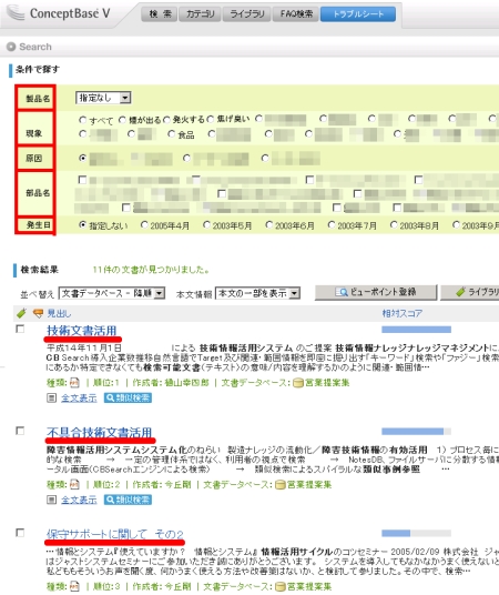 そこでC社では、各部門のデータベースに対する変更を加えずに、ConceptBase Vを使ってこれらを串刺し検索する仕組みを作った。その際、データに含まれる製品名、トラブル項目、市場評価、製品コンセプトなどの属性をキーにコンテンツの整理も実現した。