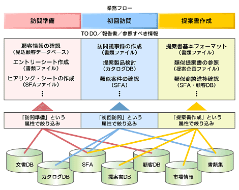 A社ではSFA(営業支援)システムを利用しているほか、顧客情報、提案書、市場情報、カタログ、各種書類といった情報別にデータベースを構築している。これをベースとして、訪問準備、初回訪問、提案書作成といった営業フェーズのそれぞれにおいて、見込み顧客データベースによる顧客情報の確認、エントリーシートやヒアリングシートの作成、SFAによる類似案件の確認、類似提案書を参照したうえでの社内統一フォーマットに基づく提案書の作成など、一連の手順を定めている。