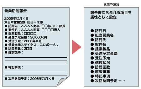 現在利用している報告書のフォームは変えずに、そのフォームに含まれる項目を属性として利用し、「サーチリザルトナビゲーション」を活用 |
