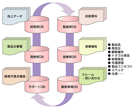 C社では、コンタクトセンターなどを通じた顧客対応履歴などの情報を大量に蓄積している。しかし、営業報告や修理報告、技術資料、製品企画など、各部門に蓄積されている情報との連携がとれていなかったため、サービス向上や新規製品開発に生かすことができなかった。