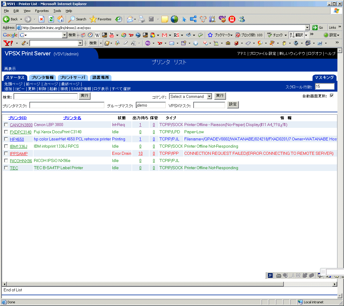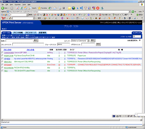 どこに設置されたどんなプリンタであっても、誰がどのプリンタに対して印刷を要求したか、その印刷ジョブはどのようなステータスにあるかをリアルタイムで確認できなければプリンティングの統制は実現しない。もちろん、印刷の成功や失敗といった印刷結果に関するステータスも、リアルタイムでユーザーに通知されることが重要である。たとえ1台でも管理できていないプリンタがあれば、そこから管理されていない情報が出力されてしまうことになる。VPSXでは、Webベースの管理情報画面によって、ネットワーク上のすべてのプリンタの稼動状況を確認することができるようになっている。