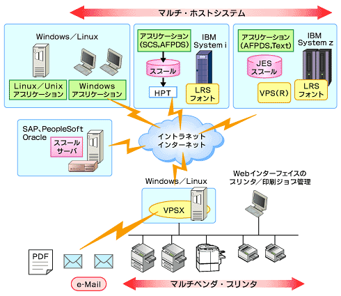 そんなLRSが展開するVPSは、IBMのz-Series上で稼働するソフトウェアスイートである。世界で5000サイト以上の実績があり、フォーチュン100社で92%のシェアを持っている。他方、オープンシステム向けのEOMソリューションであるVPSXは、UNIX・Linux・Windowsなど複数のOS、SAPなどのERPソリューション環境、メーカーとプリンタ言語が異なるプリンタ製品が混在するヘテロな環境においても、分散出力の集中管理をリアルタイムで行うことができる。VPSで培われたノウハウを継承して、高い信頼性と、1台のプリンタから数千台のプリンタにまで対応できるスケーラビリティを実現している。もちろん、メインフレームとオープンシステムが混在している環境でも、VPSおよびVPSXを導入することによって集中管理を可能にする。まさに、マルチ・ホスト・システム、マルチ・ベンダ・プリンタである。