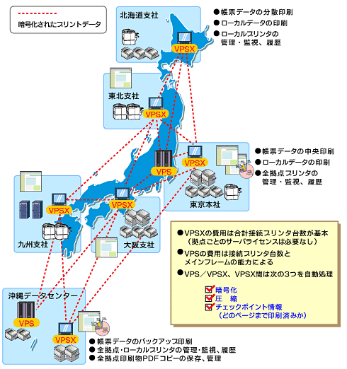 暗号化、圧縮、チェッキングポイントの機能はVPSおよびVPSX間で自動的に行われ、分散環境における印刷作業の効率を上げるとともに、印刷作業、印刷物の管理が集中的にあるいは必要に応じて分散的に実現することができる。この3つの機能はLRS社の製品で最も大きな特徴となっている。