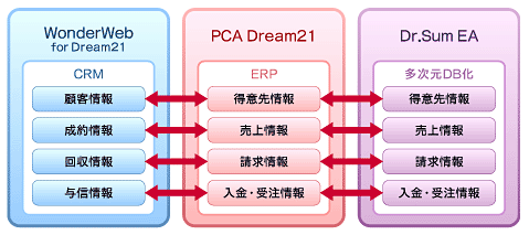 Dr.Sumから見るとインプットはいろいろとあります。今回のスキームでは、WonderWebで営業の最前線のデータが入力され、Dream21のの売上実績や経費などの基幹情報と連携、それをDr.Sumが集計していろいろなインターフェイスを提供します。また、必要に応じてデータをDream21に戻したり、営業担当者が毎日見ているWonderWebの画面にレポートしたりできます。非常に分かりやすいスキームだと思います。