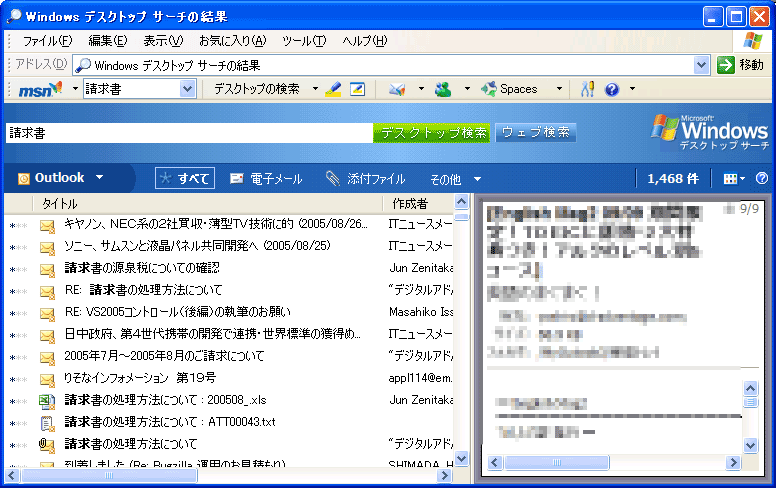 MSNサーチ・ツールバーは、Outlook 2003に保存されているメールやメールに添付されたファイル、「マイ ドキュメント」にある文書などのインデックス(検索用の索引情報)をあらかじめ作成しておき、高速な検索を可能にする。Exchange Server 2003にも対応しており、Exchangeサーバに保存されているメールやパブリック・フォルダ(共有フォルダ)のドキュメントもインデックス化の対象となる。インデックス作成は比較的重い処理だが、フォアグラウンドで別のアプリケーションが操作されたときには、自動的に処理を中断する機能などがあり、システムのアイドル時にだけインデックス作成をするため、コンピュータ利用の負担にはならない。 手元にあるOutlook 2003で試したところ、過去3年分の送受信メール約3万件(データサイズにして約2Gbytes)のデータから、「請求書」を含むものを検索した結果は、1秒ほどで、約1500件のメールが見つかった。これだけ高速に検索できると、過去に蓄積された大量のメールを、データベースとして柔軟に活用できるようになる。