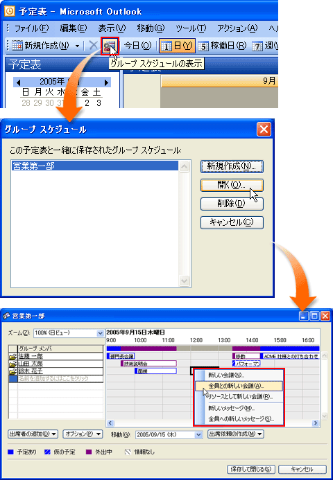 各メンバーは、日ごろのスケジュール管理をOutlook 2003の「予定表」で行う。この予定表をほかのメンバーと共有すれば、メンバー間の空き時間検索が可能になる。この場合、実際には空き時間検索が自動化できるだけでなく、会議開催予告と、それに対する参加メンバーの応答と予定表への情報入力も自動化される。会議開催の日時を指定して会議開催予告のメールを発信すると、参加予定者には次のように、会議への参加、不参加をボタン1つで返答できるメールが到着する。