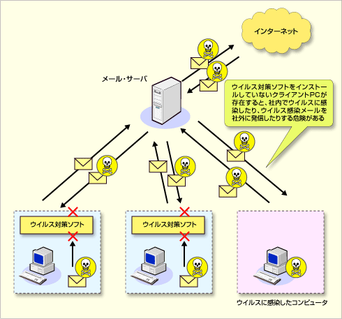 ネットワーク内のすべてのクライアント・コンピュータが対策ソフトを間違いなくインストールし、最新のパターン・ファイルに確実に更新しているなら安全性はかなり高いといえるが、実際にはそうなっていないこともある。 例えば、適切なウイルス対策が施されていない個人のノートPCを従業員が持ち込んでネットワークに接続するかもしれない。もしくは、新しくPCを導入したばかりだとか、ずっと電源をオフにしていたなど、何らかの理由から、ウイルス対策ソフトを正しくインストールしていなかったり、パターン・ファイルが更新されていなかったりするクライアントPCがあるかもしれない。 適切なウイルス対策が施されていないクライアントPCがたった1台あるだけでも、それがウイルスに感染し、感染拡大の片棒を担がされるかもしれない。特に電子メール型のウイルスでは、感染被害を社外に広げる可能性が高い。つまり、たった1台の不届き者がいるだけで、企業全体の信用が危機にさらされてしまうわけだ。