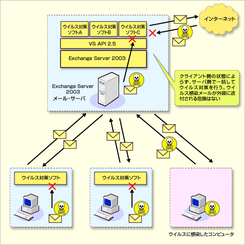 これらをExchange Serverに組み込めば、Exchange Serverを通してやりとりされるメールに対するウイルス対策をサーバ側で実施できるようになる。これにより、万一ウイルスに感染したコンピュータがあったとしても、感染メールの外部への発信をサーバ側で食い止めることが可能になる。