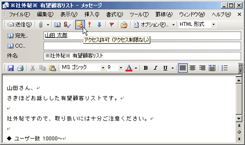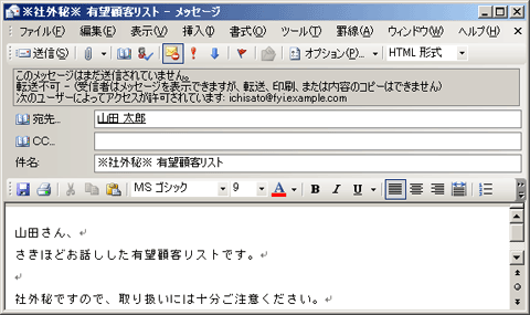 メール利用経験の長い読者なら、「転送禁止」と明記された機密情報メールの転送を受けたことが一度はあるだろう。多くは、情報漏えいなどといった深刻なものではないだろうが、このことは、ユーザー1人1人の良識に頼ってセキュリティを維持することの限界を示している。紙に印刷された情報に比較すると、電子データをコピーしたり、持ち出したり、どこかに送信したりするのは非常に手軽である。 これまでもWindowsでは、ACL(Access Control List)やPKI(Public Key Infrastructure:公開鍵暗号基盤)を利用して、特定のファイルに対するユーザーのアクセス権限を制御することが可能だった。例えば、「読み取り」権限しか与えられていないユーザーは、ファイルの内容を変更することはできないといった具合だ。 しかしファイルに対するアクセス制御だけでは、前述した機密情報メールの転送などは防止できない。これには、アプリケーション・レベルで、ユーザーの実行制御を行う必要がある。 これを可能にするのがWindows Rights Management Services(以下RMS)である。ネットワーク内にRMSサーバを配置すると、RMSサービスがActive Directoryと連携し、アプリケーション・レベルでのきめ細かなユーザー権限制御が可能になる。具体的には、電子メールやドキュメントなどに対し、転送、コピー、クリップボード転送、印刷、保存、有効期限などをユーザーごとに制限できる。ただしRMSを利用するには、必然的にアプリケーションがRMSサービスに対応していなければならない(Word、Excel、PowerPoint、Outlookの各Office 2003アプリケーションはRMSに対応している)。 ここで実際にRMSサービスの利用例をご紹介しよう。例としては、この項の最初で述べたメール転送を取り上げる。 以下は、Outlook 2003のメール作成ウィンドウである。このようにRMSがサポートされた環境では、メール作成ウィンドウのツールバーにある[アクセス許可]ボタンから、アクセス制限を設定できる。