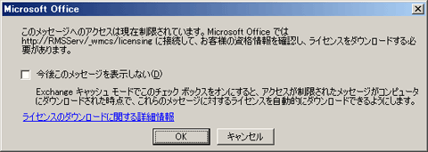 後は通常のメールと同様に、[送信]ボタンをクリックしてメッセージを相手に送信する。 次に、メッセージを受信する側のOutlook 2003で当該メールを開こうとすると、次のダイアログが表示される。これによりメッセージの受信者は、受信したメッセージにRMSによるアクセス制限が加えられていることが分かる。ここで[OK]ボタンをクリックすると、RMSサーバに対するアクセス許可の確認が実施される。