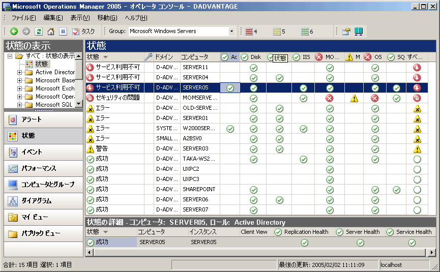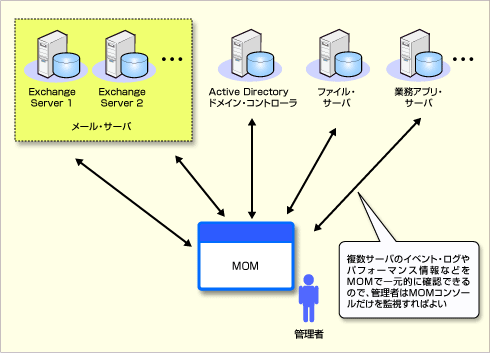 いま述べたとおり、Windowsベース・サーバの特徴の1つは、必要に応じて柔軟にサーバを拡張できることだ。Active Directoryによるディレクトリ・サービスを導入して、たとえユーザー/コンピュータの統一的な管理が可能になったとしても、物理的なサーバの数が多ければ、それだけ監視やメンテナンスにかかるコストは増える。 サーバ管理者からよく耳にする障害は、ハードディスク系のトラブルである。物理的な駆動部品が多いハードディスクは、電気系統のみのデバイスに比較すると寿命が短く、突発的なトラブルも発生しやすい。ディスク障害の発生を正確に予知することは困難だが、実際に障害が発生してから振り返ってみると、本格的な障害の前に、前兆となるような小さな障害が発生しているケースも多い。 Windowsサーバは、システムの状態をイベント・ログとして詳細に記録している。サーバのイベント・ログを厳しく監視していれば、こうした予兆を捉えて、重大な障害が発生する前に対策を施すこともできるだろう。しかし管理者の多くは、ほかにも仕事をたくさん抱えているし、多数のサーバがあるとなれば、些細なサーバの変化を厳密に監視するなど現実には不可能である。 しかし管理ツールをうまく使えば、わずかな工数できめ細かなサーバの監視ができる。こうした複数サーバの監視を目的として、マイクロソフトが開発/販売しているのがMicrosoft Operating Manager(MOM)である。原稿執筆時点では、MOM 2005が販売されている。 MOMの基本原理は、各サーバが生成するイベント・ログやパフォーマンス・ログなどを収集し、特定のパターンが発生すると、抽象度の高いアラートとして管理者にレポートするというものだ。Windowsサーバが生成する各種ログは、詳細な情報が得られる半面、あまりに微細な情報が多すぎて、複数の情報をうまく組み合わせなければ障害予知などはできない。MOMには、「管理パック」と呼ばれるナレッジ(知識)が凝縮されており、従来は豊富な経験が必要だった解析作業を強力に支援してくれる。