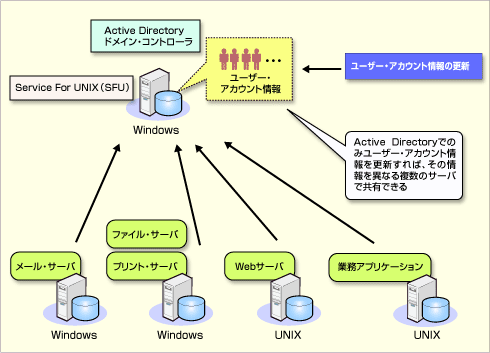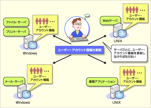 この原因の1つは、ユーザー・アカウント情報が一元管理されておらず、複数のサーバで分散管理されていることにある。このような環境では、ユーザー1人を移動させるだけでも、複数のサーバ上でユーザー・アカウントを更新しなければならない。サーバがN台あれば、単純計算でも作業はN倍必要だ。しかし現実はWindowsとUNIXなど、異なるプラットフォームで構成されている場合も多く、環境ごとに異なる手順を踏んだり、サーバの用途(業務アプリケーションか、Webサーバかなど)によって、設定内容を調整したりしなければならず、さらに負担が大きい。