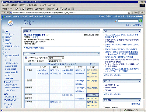 SharePointでは、ASP.NETベースで作成されたWebパーツと呼ばれる部品を組み合わせることで、望みのチーム用ポータル・ページにカスタマイズ可能だ。すでに、典型的な用途向けのWebパーツが多数提供されている。先ごろ発売されたGroupBoardワークスペース(WSSのアドイン)もその1つで、WSSに追加インストールすることで、グループスケジュール、施設予約、電話メモ、回覧機能、モバイルアクセスなどといった機能をパーツとして利用できるようになる。手ごろなパーツがセットになっているので、SharePointの導入用として重宝するだろう(本稿でも、WSS+GroupBoardワークスペースで構築したサイトを例として使用することにする)。 前述したとおり、WSSで構築された複数のチーム・サイトが存在するような大企業向けでは、SharePoint Portal Server(SPS)を導入することで、チーム・サイト間にまたがる検索やシングル・サインオン(1カ所でログオンすれば、認証された権限でどのチーム・サイトも利用できる)を実現可能だ。