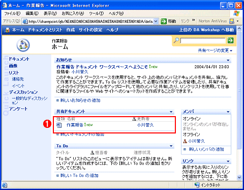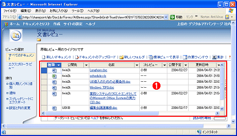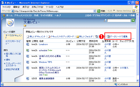 基本的にWebアプリケーションであるSharePointチーム・サイトは、通常はWebブラウザで操作することになる。Webブラウザの欠点は、すべての操作がWebページ単位で実行されるため、複数のリスト・データをまとめて入力したり変更したりする場合でも(例えば、複数のスケジュールを入力するなど)、1つずつWebページを開いて入力しなければならないことだ。例えば、20個あるリストのステータスを「作業中」から「終了」に変更しなければならないとすると、リストの各項目に対応するWebページを開いて、ステータス項目を「作業中」から「終了」に変更し、保存するという作業を20回繰り返すことになる。面倒なだけでなく、こうした入力作業が常態化するような場合は、作業の生産性を大きく低下させることになる。 しかしOffice Professional Edition 2003をインストールしている場合は、SharePointサイトをブラウザで操作する場合も「データシートで編集」機能が使える。これは、IEからActiveXベースのコンポーネントを起動し、この内部でExcel形式で複数リストのデータをまとめて編集できるようにするものだ。例えば次は、SharePointのドキュメント・ライブラリをIEで表示したところである。各リストのプロパティを変更するには、項目のリンク文字をクリックして、その項目に対応する編集用ページを表示する必要がある。