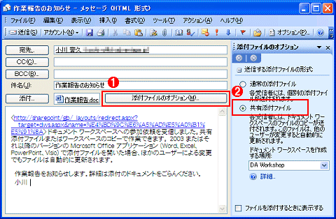 共有添付ファイルを指定すると、指定のドキュメントがSharePointサイトのドキュメント・ワークスペースに転送され(ドキュメント・ワークスペースが作成される)、そのコピーがメールに添付される。メールを受信したユーザーが添付ファイルを更新すると、ドキュメント・ワークスペース上のファイルが自動的に更新される。