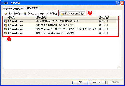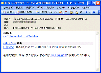 Outlook 2003は、この通知メールに対してSharePointによって付けられるメール・ヘッダを認識し、通知メール独自の仕訳ルールを適用できる。