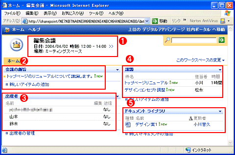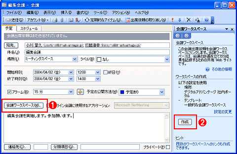 会議ワークスペース・サイトは、Outlook 2003で会議予定を入力する際、会議出席依頼の送信用ウィンドウから作成できる。