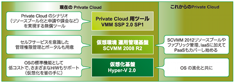 OSの標準機能として仮想化ソフトウェアが実装されていることは、技術者のスキル管理の面でもメリットがあるという。仮想化専用製品を導入した場合には、仮想化以外の他のシステムとは別に、その製品に特有のスキルを習得しなければならず、特定ベンダーの枠組みの中に身を置くことになりがちだ。しかし、Hyper-VはあくまでWindows Serverの一機能という位置付けなので、Windowsプラットフォーム上のさまざまな製品や技術との親和性が高い。仮想化をベースに将来的なプライベートクラウド(サービス化)への移行を考える上では、仮想化のテクノロジーと、仮想化以外のテクノロジーとの間の親和性が重要なポイントになるが、Hyper-Vはこの点においても有利なソリューションだといえるだろう。