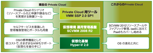 「Hyper-Vによる仮想化、SCVMMによる仮想化環境の管理基盤と簡易プライベートクラウドの実現、そしてVMMSSPによる本格的なプライベート環境の構築。これら3段階の中から、顧客のニーズに応じて使いたいものを使っていただく。これが、マイクロソフトのプライベートクラウドに対するスタンスだ。他社のプライベートクラウドソリューションと比べ、幅広いお客さまの現場ニーズに応えられるアプローチであると自負している」(高添氏)