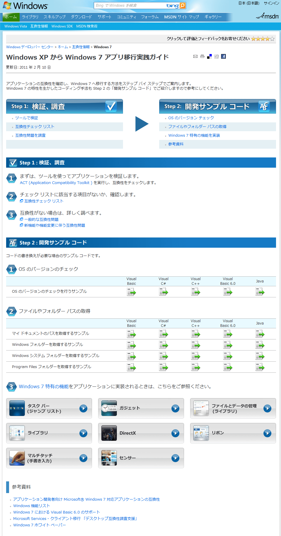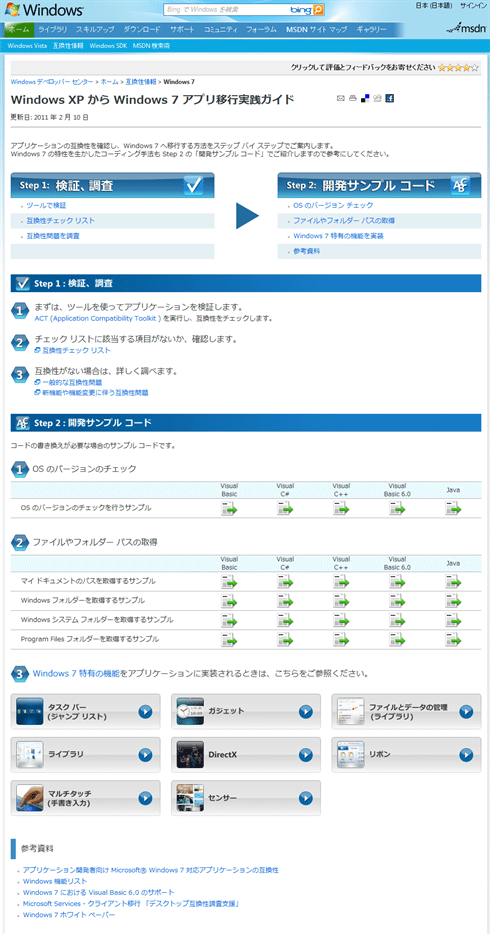 これまでMSDNオンライン各所に分散していた移行に関する情報が、この『ガイド』に集約されており、Java開発者のための情報など多くの開発者に向けた情報が提供されているので、移行の際にはまず『Windows XP から Windows 7 アプリ移行実践ガイド』を訪れてみてほしい。