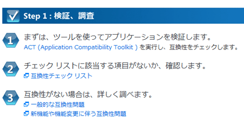 『ガイド』によると、「まずは、ツールを使ってアプリケーションを検証する」とある。このツールとは「ACT(Application Compatibility Toolkit:アプリケーション互換性ツールキット) 5.6」である。