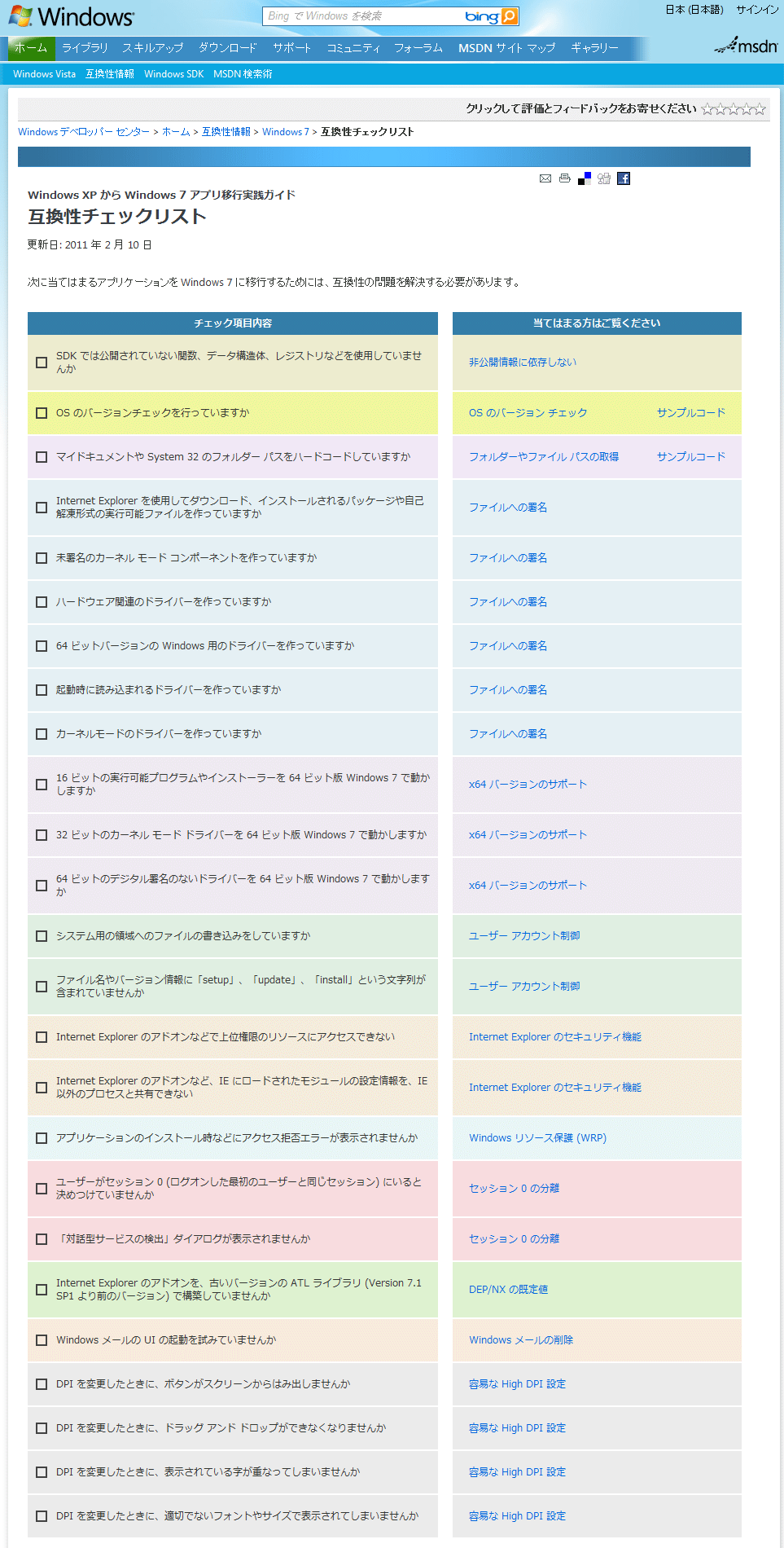 筆者の場合は、例えば「SDKでは公開されていない関数、データ構造体、レジストリなどを使用していないか」というチェックリスト項目を確認するために、ソース・コード内にあるすべてのWin32 API(AttachThreadInput関数やSetWindowsHookEx関数など)を念のためMSDNライブラリでチェックした。